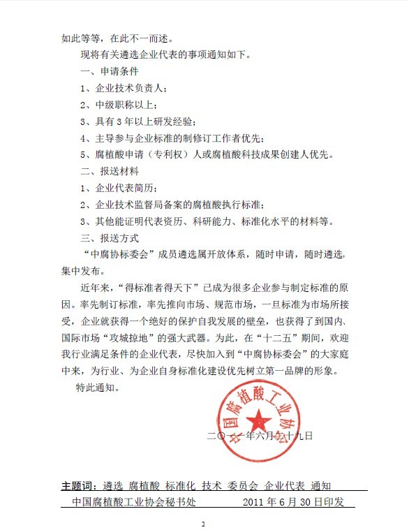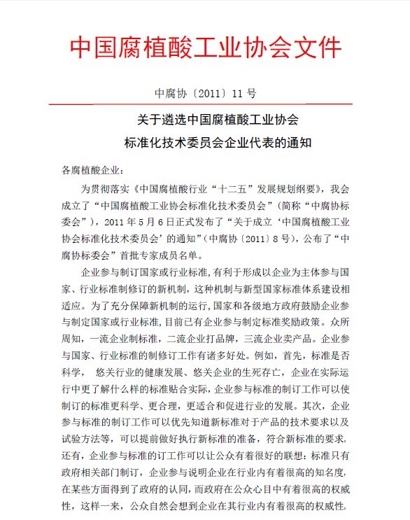 关于遴选中国腐植酸工业协会标准化技术委员会企业代表的通知