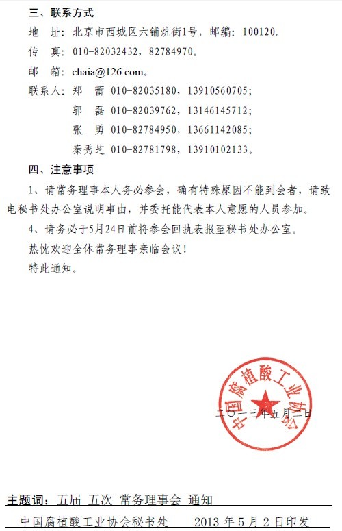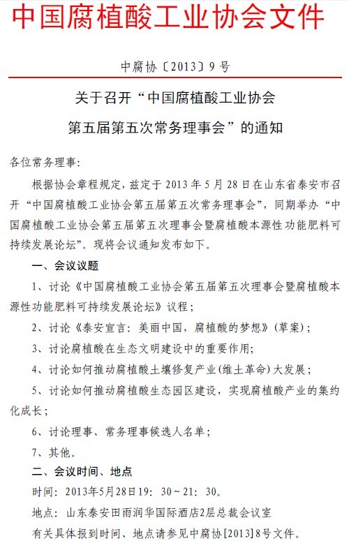 关于召开“中国腐植酸工业协会第五届第五次常务理事会”的通知