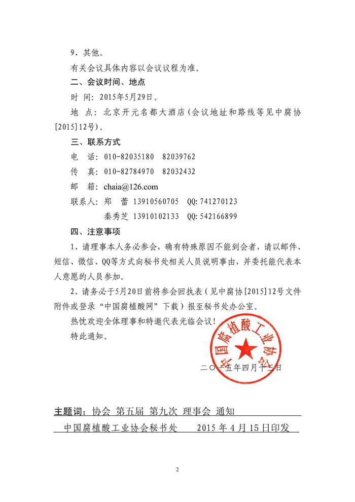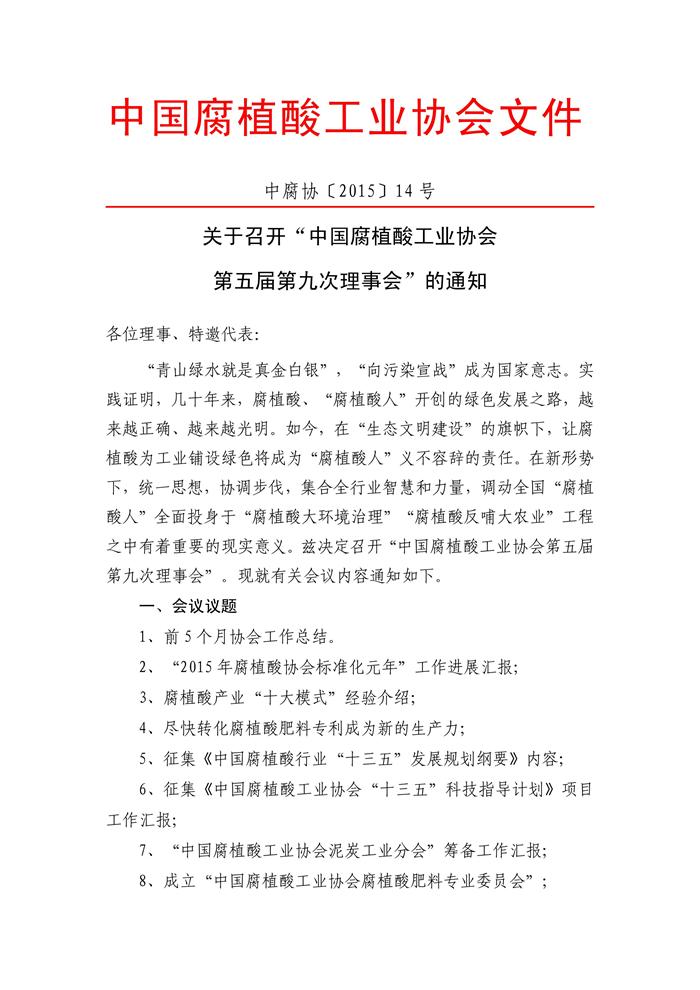 关于召开“中国腐植酸工业协会第五届第九次理事会”的通知