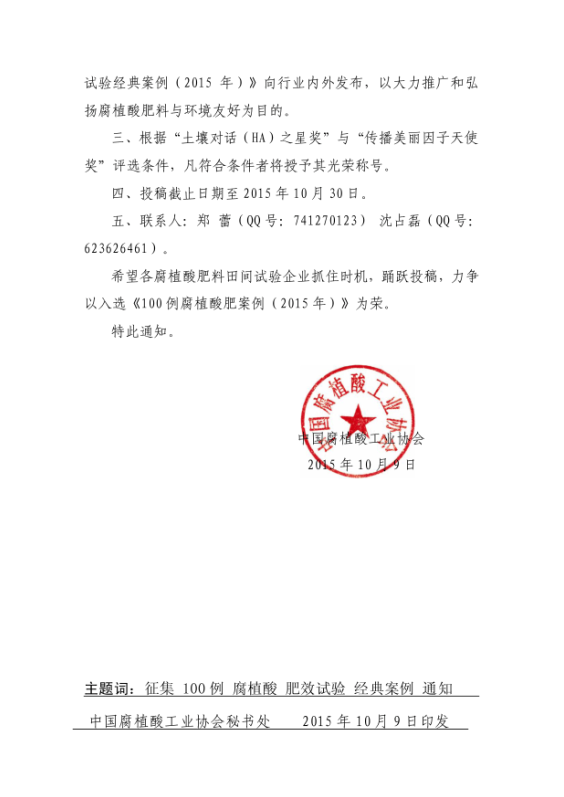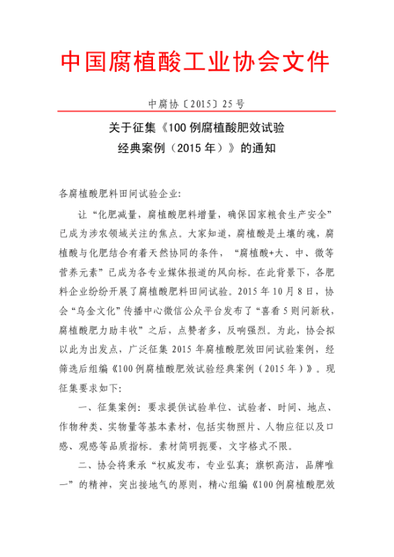 关于征集《100例腐植酸肥效试验经典案例(2015年)》的通知